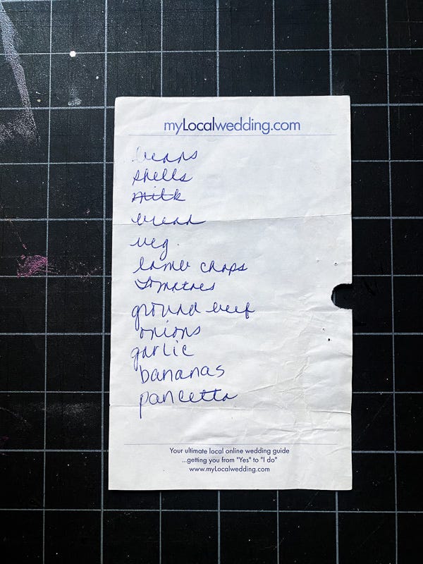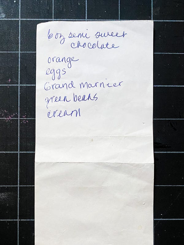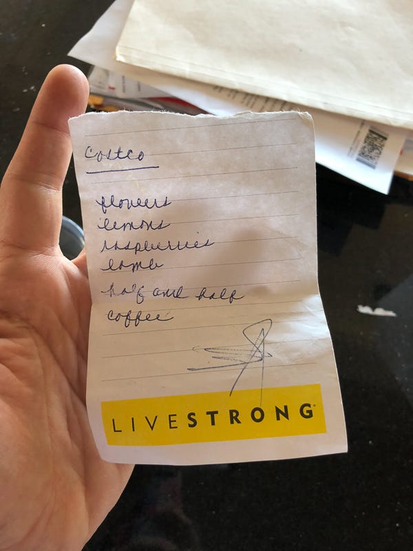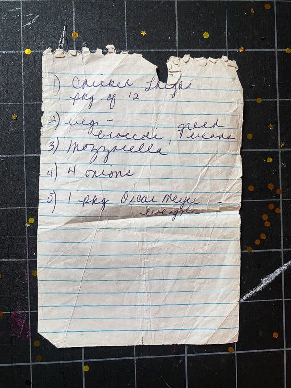 This is my Mom’s last grocery list. She went to Costco the night before she was rushed to the hospital. I found it in her purse when while looking for her wallet in the ER. We found the groceries in the back of her car a few days after she died. She stocked my Dad up before she left.