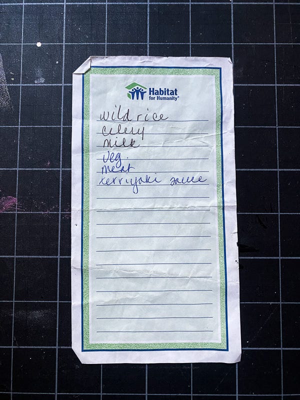 After she died, I stumbled into A LOT OF her lists while I was cleaning out her kitchen. Most of them were in were in old recycled notebooks (from my childhood!) and a bunch of scrap paper/charity notepads she got in the mail. I shoved them all in an envelope for safekeeping and I look at them every now and then when I need a “hit” of her.