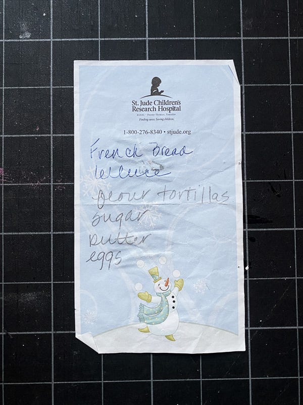 My Mom never bought flour tortillas so this one stumped me! She also forgot to cross the tt in lettuce. I am imagining her making French toast with this list. Maybe she was making tacos?